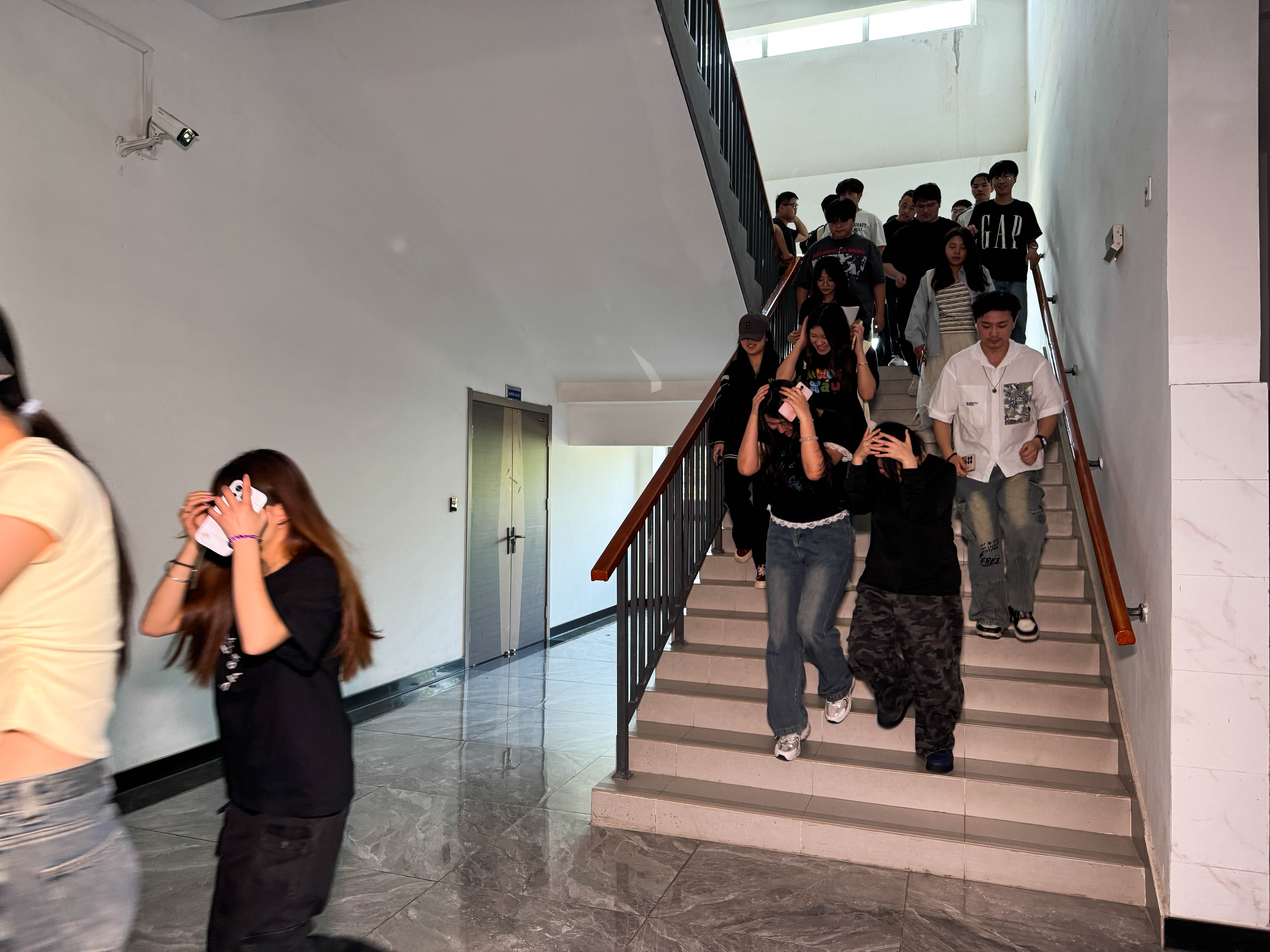 5月12日下午,保卫处联合信息工程与传媒学院、汽车工程学院分别在两校区开展地震应急避险演练活动。演练开始前一天,参演班级组织召开主题班会进行避险逃生安全知识教育。演练模拟突发地震场景,师生正在教学楼、实验实训楼上课,随着警报声响起,学生就近躲于课桌下,用书包或书本保护头部;主震结束后,在教师引导下弯腰护头,沿预定路线快速撤离至校园广场等安全区域。演练过程中,各楼层、关键点位均有教职工值守,确保疏散秩序。